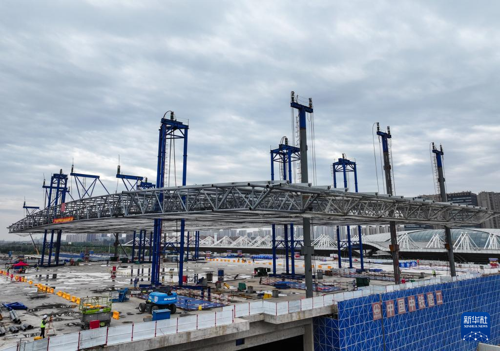 10月19日拍摄的新建上海至南京至合肥高速铁路南通站高架站房钢结构提升作业现场(无人机照片)。