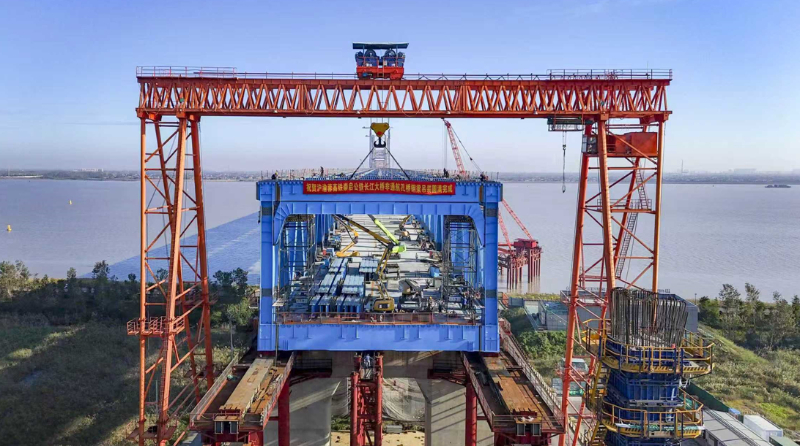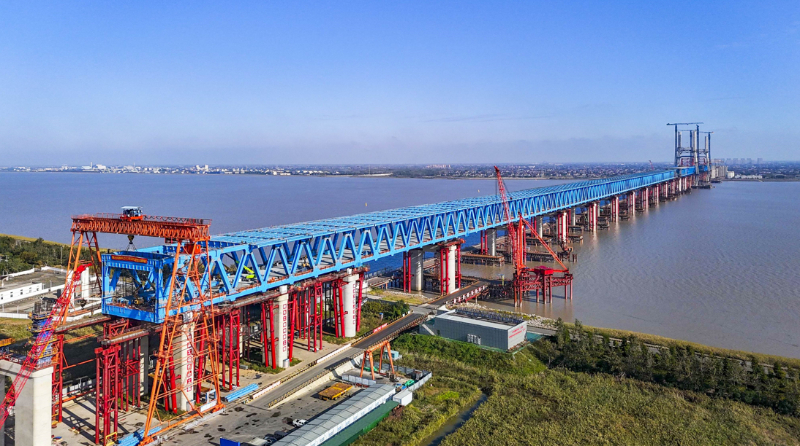 10月31日,一根长21.2米,高1.922米,重34.61吨,编号为A87公路横梁杆件吊装组拼就位,标志着由中铁大桥局承建的新建上海至南京至合肥高速铁路沪宁段站前Ⅴ标崇启公铁长江大桥主桥非通航孔桥钢梁公路横梁吊装组拼全部完成。