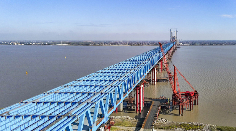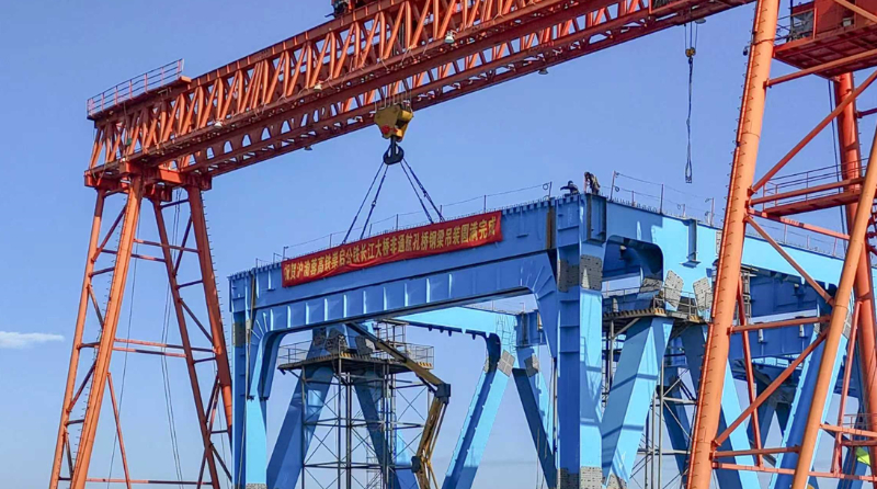 据现场负责人张晓波介绍:此次吊装组拼完成的是非通航孔最后一根公路横梁。钢桁梁由工厂制造,水路运输至桥位处码头,去年6月6日开始在大桥南岸钢梁预拼场吊装组拼。非通航孔桥钢梁公路横梁吊装组拼全部完成为最后一轮顶推和后续与主通航孔钢梁“会合”以及公路桥面板安装等施工创造了有利条件。