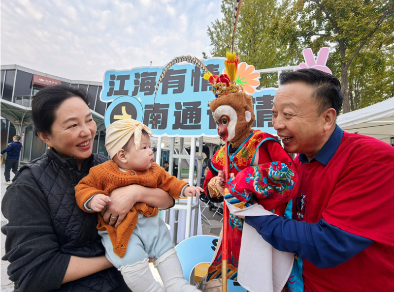 来自南通如皋市的杖头木偶戏,以杖头木偶为核心,“顶、拉、提、勾”等动作惟妙惟肖,不仅吸引了大人的驻足,还让几个月大的宝宝满怀好奇。