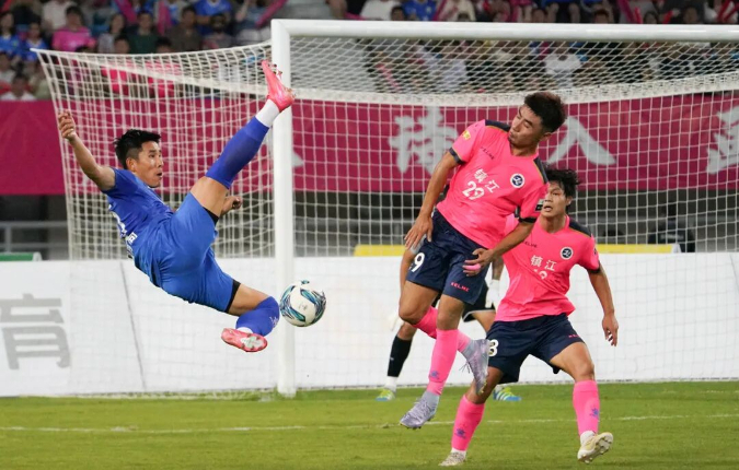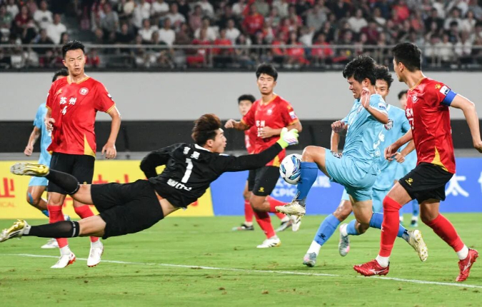 10月4日,南京VS连云港,李博 摄。“苏超”四分之一决赛中,南京队球员戈伟亲吻足球,准备点球。当日,南京队主场通过点球5:3战胜连云港队,晋级半决赛。