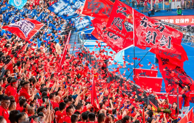 8月17日,南通VS连云港,许聪 摄。比赛结束后,南通球迷挥舞彩旗、抛洒胜利彩纸,激情庆祝南通队获胜。