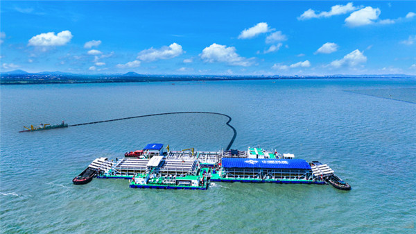 在无锡宜兴水域,一座名为“太湖之光”的水上“移动工厂”正24小时运转。它由多艘作业船串联而成,管道纵横、设备密布。