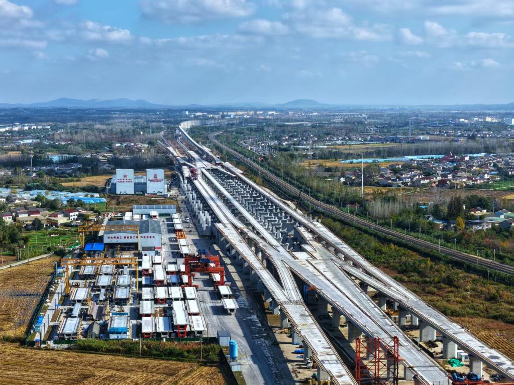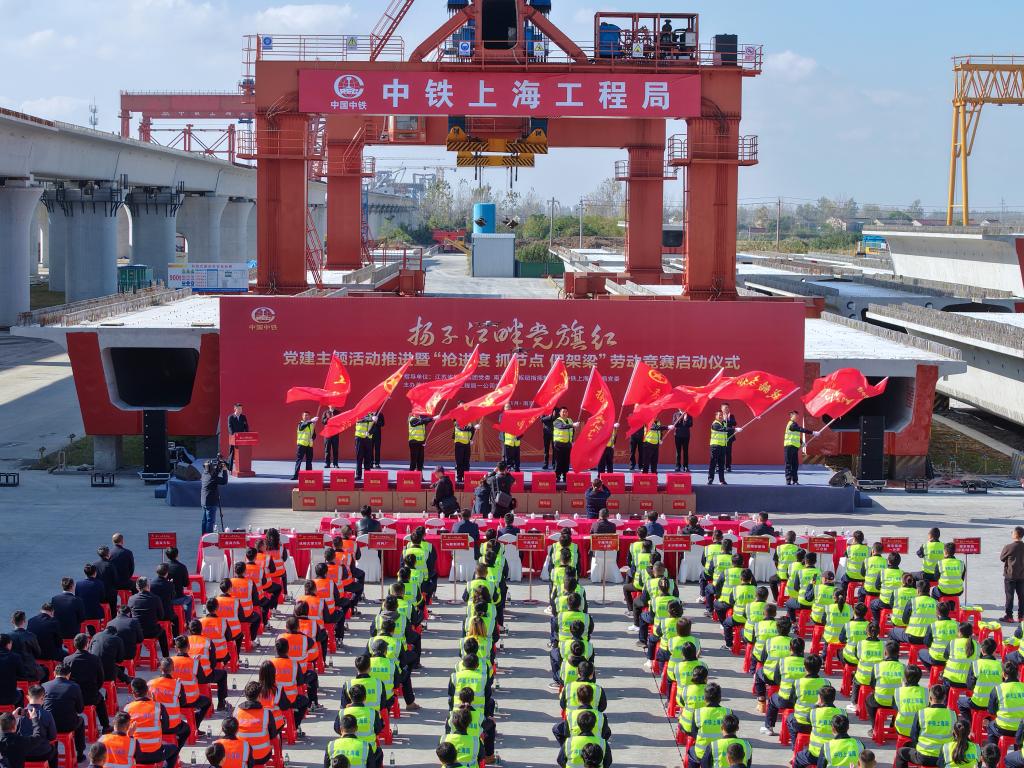 11月11日,中铁上海工程局在宁淮城际铁路马鞍制梁场举行“抢进度、抓节点、保架梁”劳动竞赛活动,全力推进沪渝蓉高铁南京枢纽、宁淮城际铁路建设。