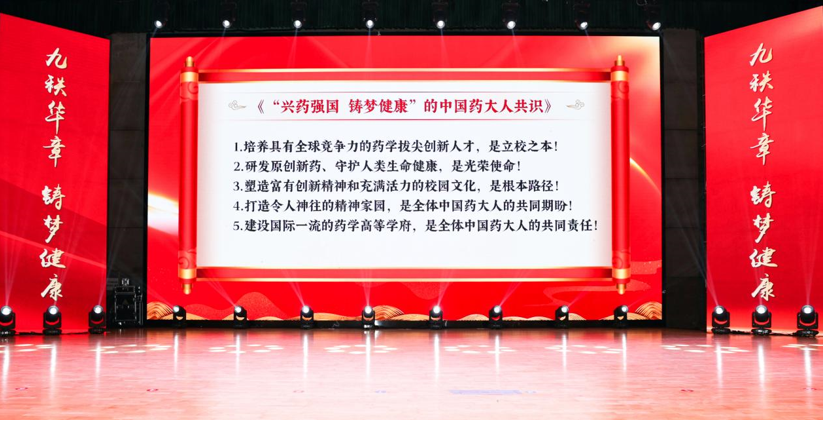 仪式上发布了凝聚全球药大人共识的《“兴药强国 铸梦健康”的中国药大人共识》,并启动了从湖北始发的全球校友校旗传递活动。捐赠环节中,国邦医药集团与花红药业集团分别向中国药科大学捐赠1000万元,鼎力支持学校未来发展。戴建君书记在讲话中向所有关心支持学校发展的各界人士致谢,并号召全体师生员工以昂扬姿态和卓越成就,迎接九十华诞。仪式在校歌的激昂旋律中圆满落幕。