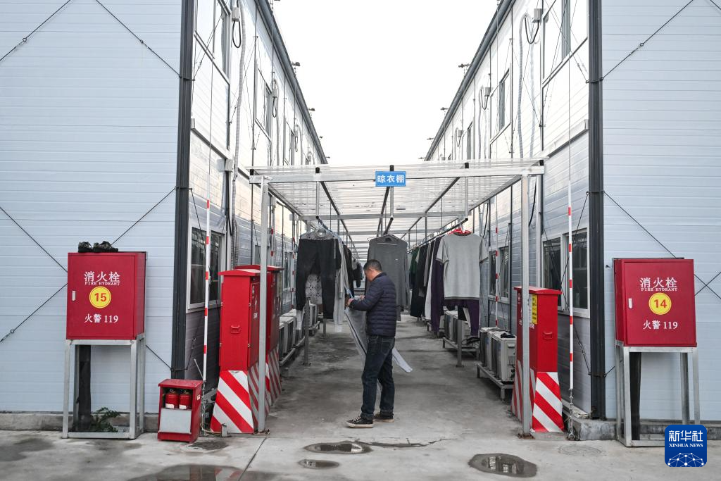 11月25日,工人在苏州北站新时代建筑工人社区住宿区收衣服。