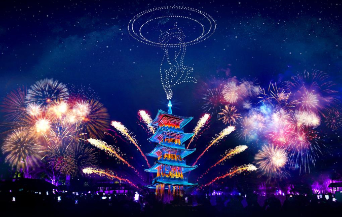 今年3月,拈花湾微笑广场的“AI塔”成为科技赋能传统文化的新典范——千架无人机以塔为轴,在夜空中精准勾勒“拈花一指”的诗意画卷,配合塔身精密的烟花燃放装置,再现星河流转的震撼场景,将春节期间爆火的AI视频转化为常态化、高品质演艺,有力推动景区从“网红打卡地”向“长红度假地”跨越。