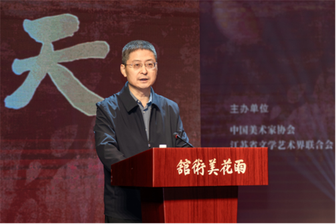 江苏省文联二级巡视员韩军讲话。他首先向关心支持江苏省美术事业发展的各级领导表示感谢,并向入围青年艺术家表示祝贺。他指出,“雨花满天”美术展览品牌历经七年发展,已成为推动精品创作、发现培养青年美术人才的重要平台。本届展览聚焦写意画创作方向,涵盖人物、山水等领域,作品展现出青年艺术家扎根传统、呼应时代的创作探索,为当代中国画的发展注入了蓬勃的青春力量。