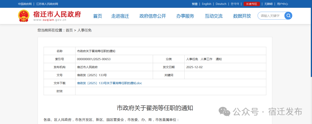 12月2日,宿迁市政府发布了最新的人事任免通知,具体如下: