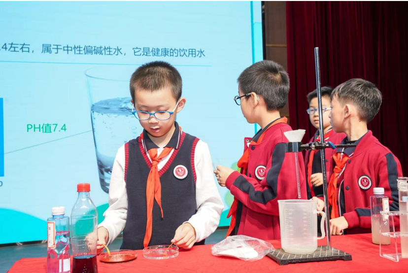 如果说沉淀过滤实验让孩子们惊叹,那么接下来的酸碱度测试实验,则将课堂气氛推向了顶点。“有哪位同学喜欢喝可乐呀?”几乎全班同学都举起了手。老师笑着拿出了可乐、自来水与pH试纸,邀请10余名学生代表化身“小小检测员”,亲手操作实验。结果显示:自来水对应的试纸呈中性淡绿色,可乐对应的试纸则迅速变为深红色。“红色代表强酸性,我们的自来水是中性,非常温和,是最适合我们人体和日常生活的健康好水。”亲眼见证了这一场精彩的“颜色对决”,孩子们对健康饮水有了最直观的认识。