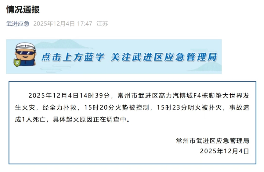 12月4日,常州市武进区应急管理局发布情况通报称,当日14时39分,常州市武进区高力汽博城F4栋脚垫大世界发生火灾,经全力扑救,15时20分火势被控制,15时23分明火被扑灭,事故造成1人死亡,具体起火原因正在调查中。