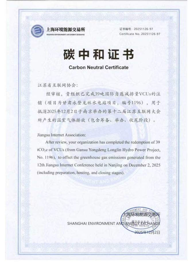 为积极响应国家“双碳”战略,推动绿色低碳发展,本次大会特别引入“零碳办会”理念。会议现场,在上海环境能源交易所副总经理彭峰与江苏省互联网协会副秘书长张庆的见证下,碳管理体系(南京)服务中心总经理毕飞为第十二届江苏互联网大会颁发了碳中和证书。