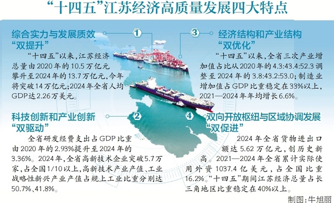 “我省综合实力与发展质效实现‘双提升’,高质量发展步伐稳健。”省统计局副局长马俊表示,江苏经济总量即将在今年跨过“十四五”期间第4个万亿元台阶。在综合实力稳步增强的同时,更加注重提升经济发展质效,全员劳动生产率由2020年的21.3万元/人提升至2024年的28.4万元/人,2021—2024年年均增速高于GDP年均增速0.5个百分点。