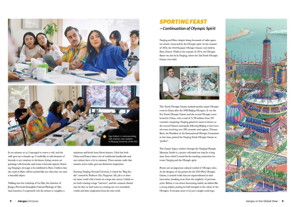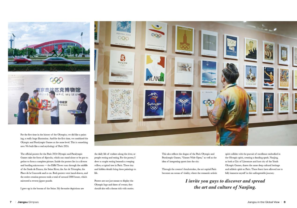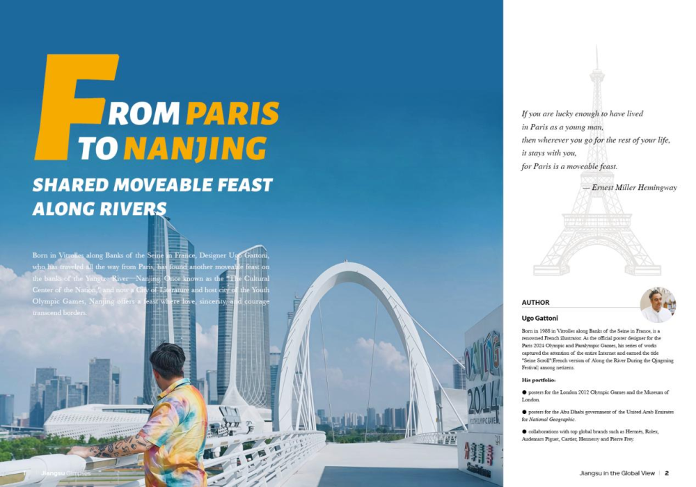 本期文旅指南“国际友人看江苏”栏目邀请法国著名插画艺术家Ugo Gattoni撰稿。他设计的2024巴黎奥运会和残奥会官方海报备受瞩目,作品被网友誉为“塞纳上河图”。其作品包括2012伦敦奥运会及伦敦博物馆海报、《国家地理》杂志、阿联酋阿布扎比政府相关海报等。