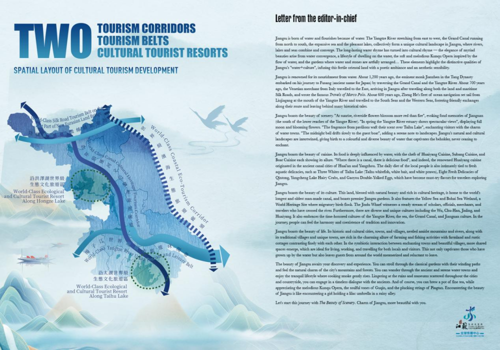 2025年夏,“水韵江苏”全球传播中心出品的Jiangsu Glimpses文旅指南《美的风光》出刊,向世界重磅推荐江苏多彩多姿的水韵之美。该期以江苏江河湖海“水+”文化为主线,依据江苏浩荡的江河湖海和精妙的小桥流水资源设计线路,包含大江大河、湖光海色、水乡温泉、赶海漂流、亲水乐园等单元主题,展示江苏“两廊两带两区”的水韵精彩,展现江苏各美其美、美美与共的旅游发展格局,彰显世界重要旅游目的地的神韵与魅力。