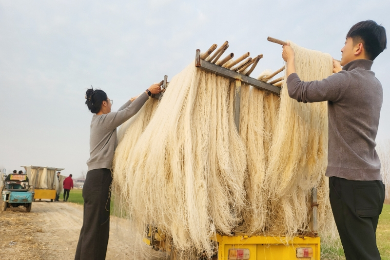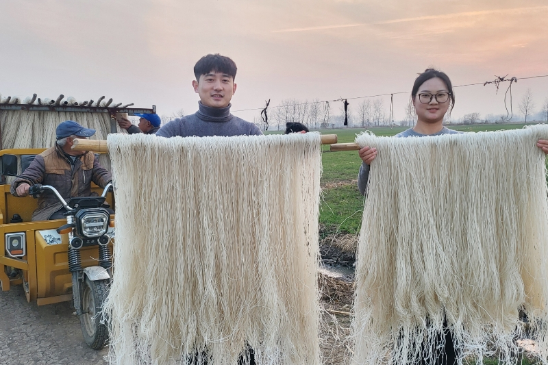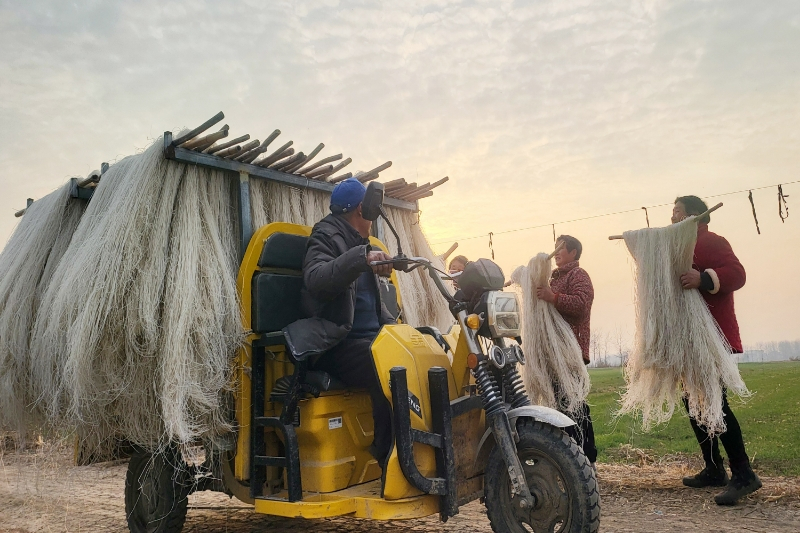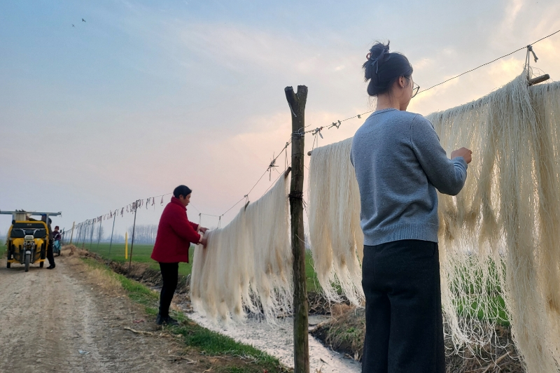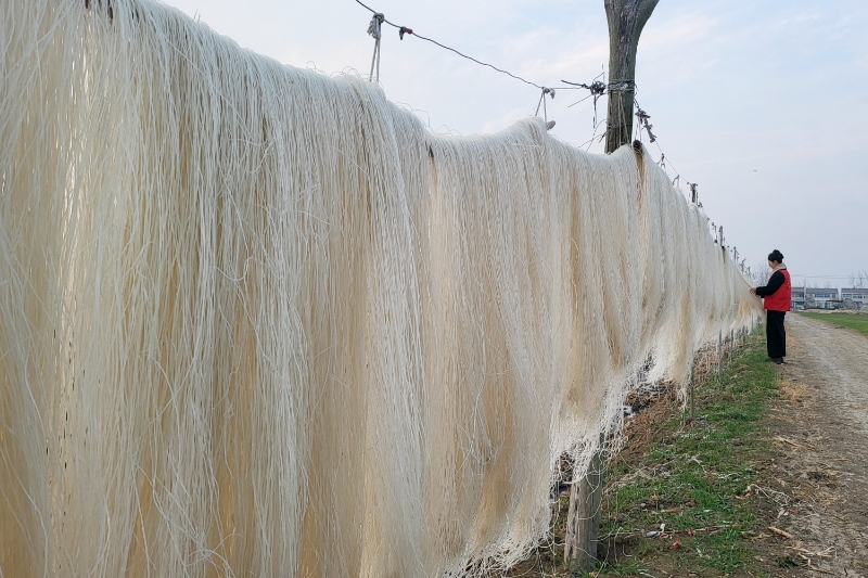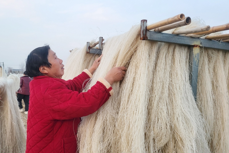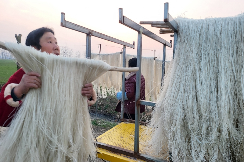 正值冬闲时期,灌云县农家传统手工粉丝迎来生产销售旺季,12月14日,江苏省连云港市灌云县南岗镇南于村,村民晾晒粉丝供应市场。(范巍 吴晨光)