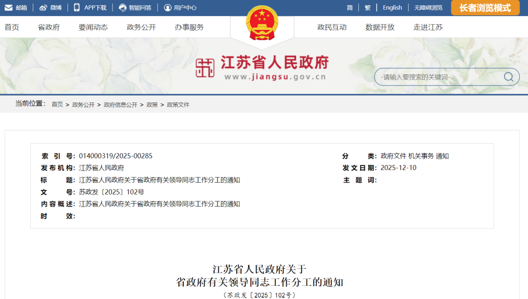 12月15日,江苏省政府官网发布了关于省政府有关领导同志工作分工的通知。具体如下: