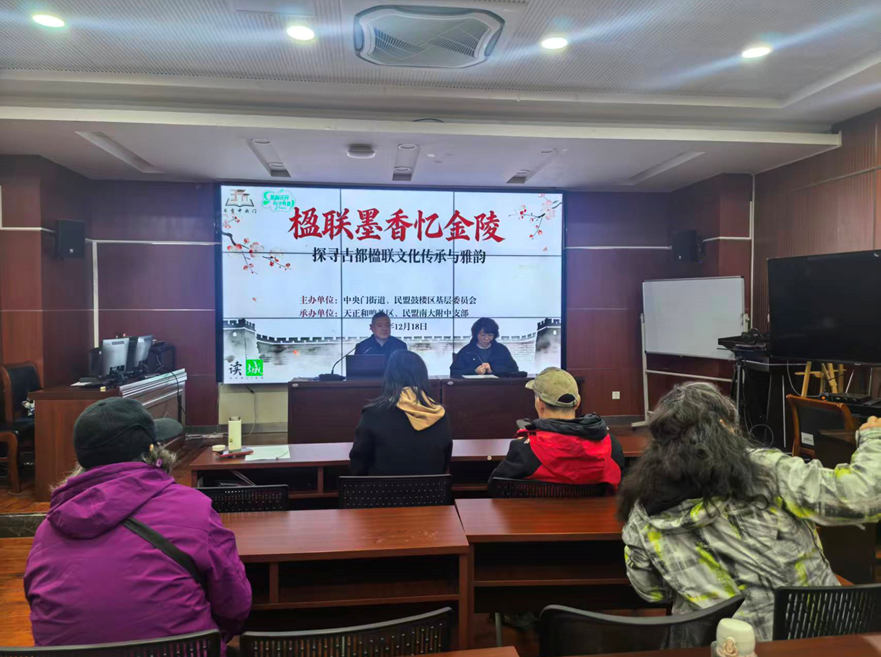 12月18日,南京市鼓楼区中央门街道“茉莉花开·与宁共赏”系列文化活动再飘书香。一场以《楹联与南京》为主题的文化讲座在街道党群服务中心温情开讲,吸引众多社区居民参与。本次活动由中央门街道与民盟鼓楼区基层委员会共同主办,天正和鸣社区与民盟南大附中支部承办,特邀江苏省优秀青年教师、南京市楹联家协会教育委员会主任黄安全担任主讲,带领居民在平仄对仗间领略非遗魅力,探寻南京城的千年文脉。