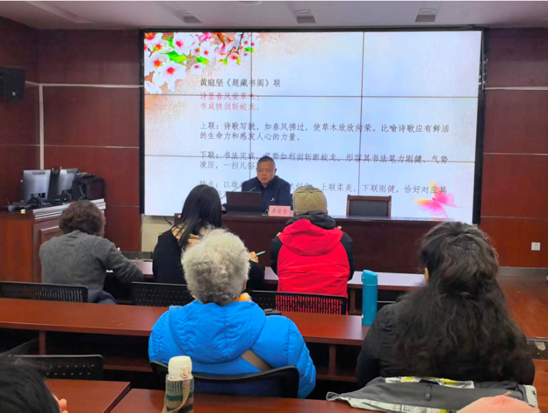 讲座现场,黄安全老师以“楹联——中华传统文化的瑰宝”为开篇,系统梳理了楹联逾一千四百年的发展脉络。他指出,楹联作为植根于民间的文学形式,兼具文学性、艺术性、格言性、哲理性等多重特质,是汉字运用的巅峰艺术,更是融入国人血脉的文化基因。尤为值得关注的是,南京与楹联有着深厚渊源——早在南朝梁代,建康(今南京)便已出现成熟门联,刘孝绰“闭门罢庆吊,高卧谢公卿”与刘令娴“落花扫仍合,聚兰摘复生”的对句,比五代时期公认的最早春联早四百余年,印证了南京作为楹联发祥地的重要地位。
