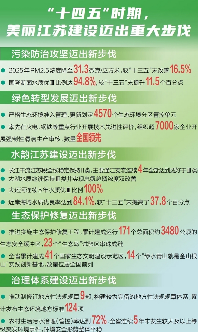 当一组组数据化作“绿色坐标”,江苏的五年发展轨迹清晰可见——高水平保护支撑高质量发展的“方向盘”,正引领美丽江苏驶向更广阔未来。(洪 叶)