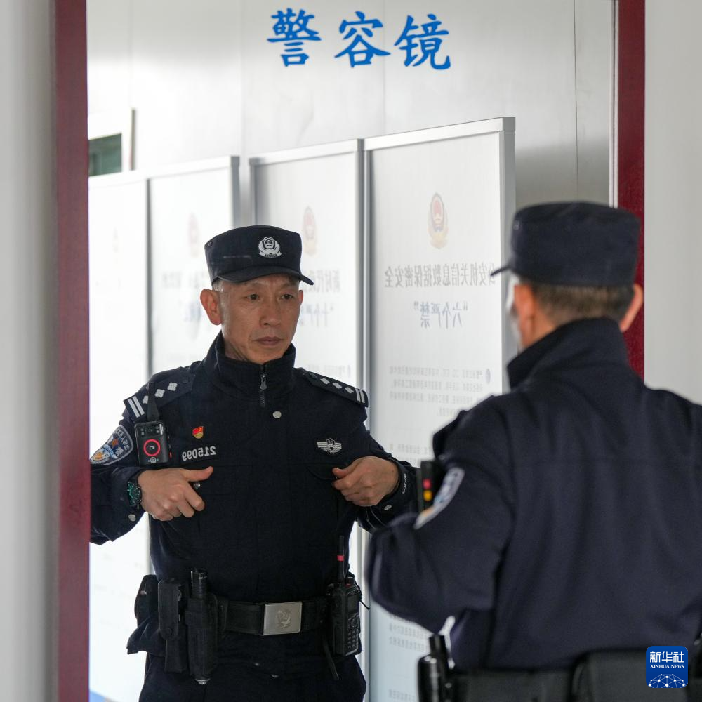 1月8日,民警赵阳在南京市公安局建邺分局沙洲派出所警容镜前整理警服。