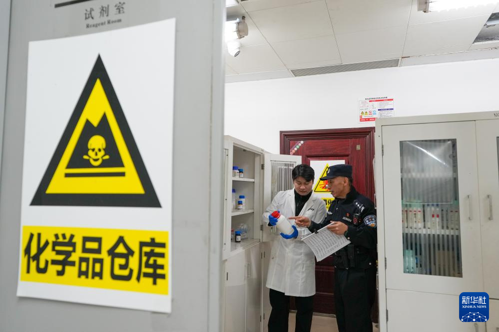 1月8日,民警赵阳(右)在辖区内一家单位的化学品仓库检查化学品存放情况。