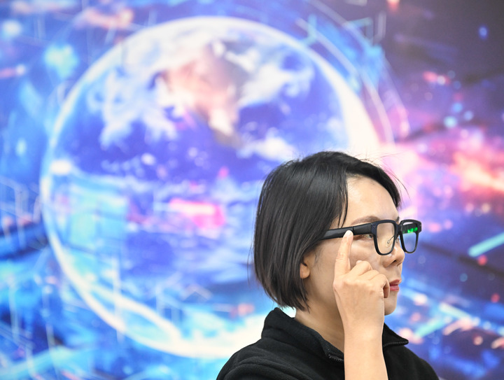 2025年12月4日,在“AI·镜界—南京人工智能生态街区”,工作人员展示一款AI眼镜。新华社记者 季春鹏 摄