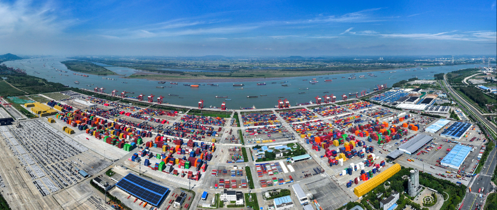 繁忙的南京港龙潭港区集装箱码头(2024年9月25日摄,无人机全景照片)。新华社记者李博摄