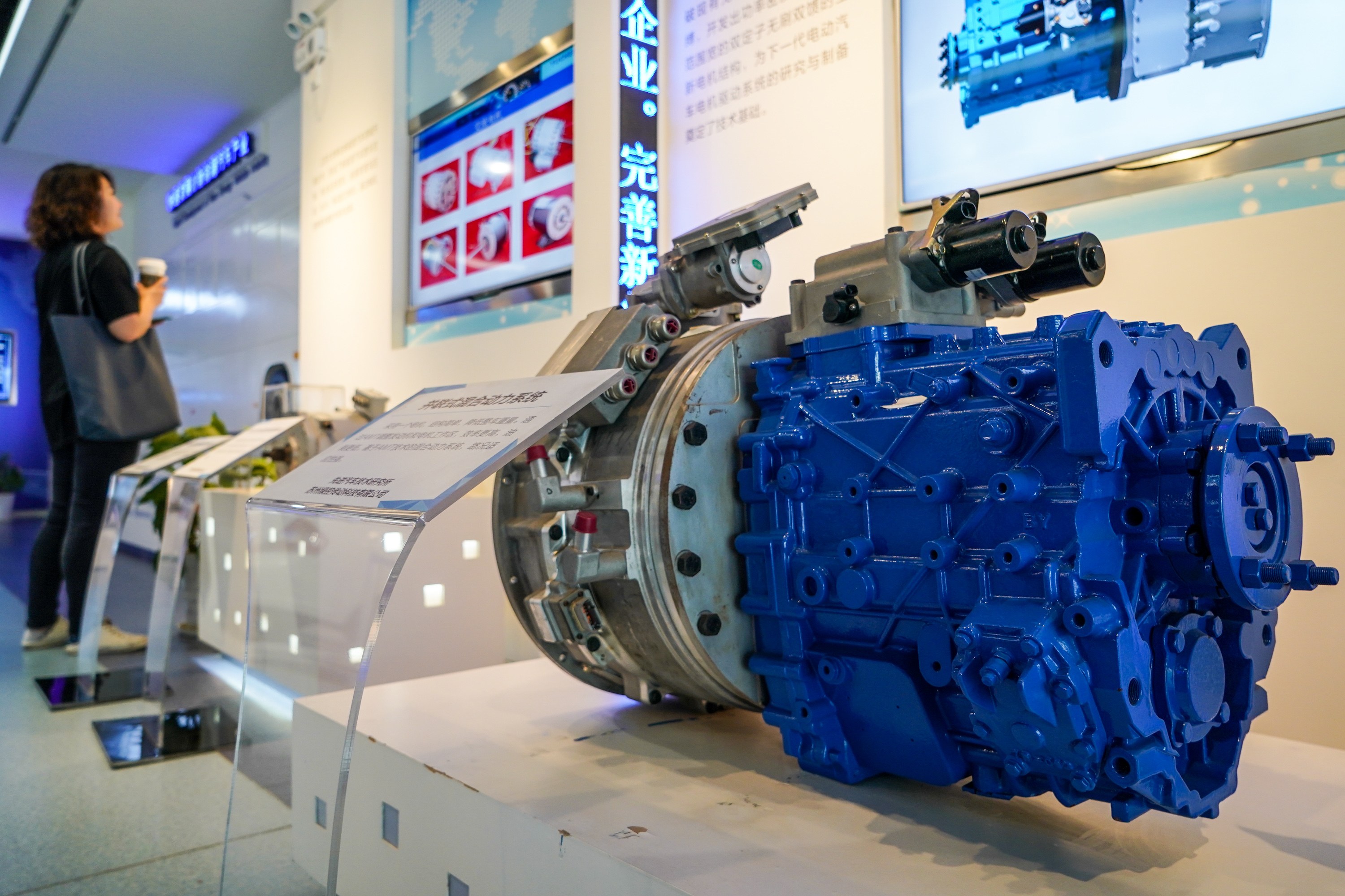 江苏省产业技术研究院产业创新发展馆内展示的汽车并联式混合动力系统。新华社记者 李博 摄