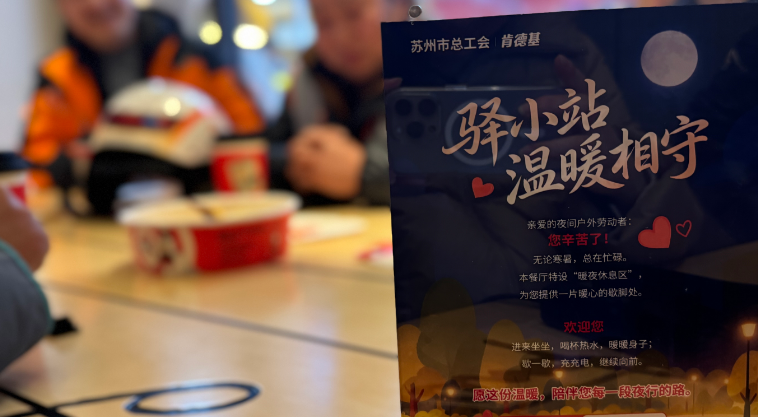 1月20日,室外寒风阵阵,苏州东吴北路肯德基店内暖意涌动,几位滴滴代驾司机结束了短暂奔波,在这里休息歇脚、充电饮水。这家肯德基就是苏州首批开放的4家“驿小站”之一,为代驾司机、外卖骑手等夜间户外劳动者开辟出专属休息区,成为寒冷冬夜里一个温暖的落脚点。