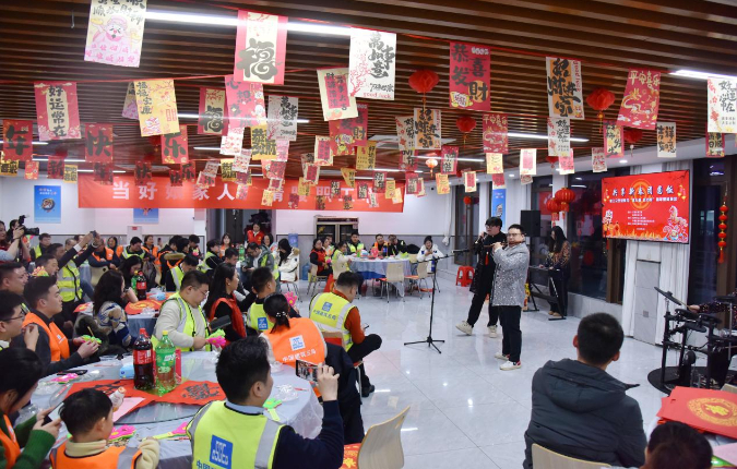 活动中还穿插了互动问答和“我做你猜”“成语接龙”等游戏环节,工友们踊跃参与,现场欢声不断。多位书法家也来到现场,挥毫书写春联和“福”字,将浓浓年味传递给每一位工友。