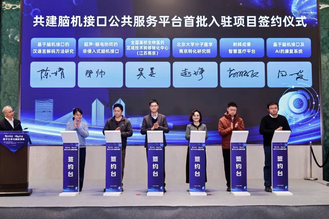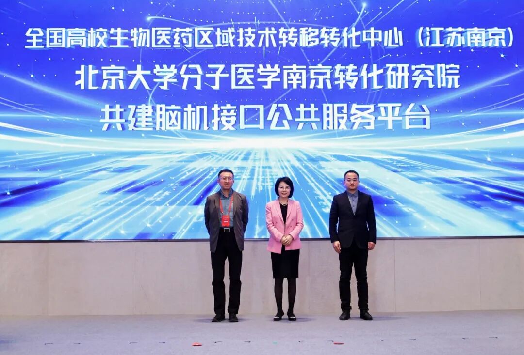 此外,脑机接口公共服务平台启动暨首批项目入驻。北京大学未来技术学院院长肖瑞平、南京生物医药分中心常务副主任阚苏立、北京大学未来技术学院副书记刘晋伟共同发布该平台。平台由全国高校生物医药区域技术转移转化中心(江苏南京)与北京大学分子医学南京转化研究院共建,致力于构建“技术研发—中试验证—产业落地”一站式服务体系。
