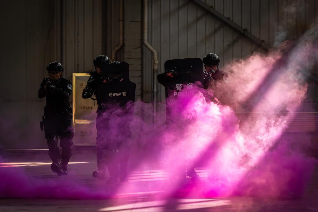 与此同时,搜查二组将另一“嫌疑人”逼入场区空置仓库后,“嫌疑人”负隅顽抗,拒不投降,现场指挥员迅速评估处置方案,果断下令实施强攻。狙击组在外围严阵以待,保持警戒;突击组在门外完成攻击前准备,随后投掷爆震弹掩护突入,最终成功制服“嫌疑人”。民警们配合默契,展现出高超的战斗技能和应急处置能力。