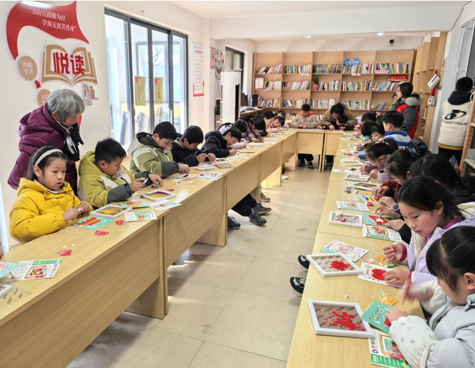 童心巧手迎新春。针对儿童群体认知特点与成长需求,各党群服务阵地强化“家校社”三方协同,设计兼具文化启蒙与手工创意的实践项目。河西社区联合新桥幼儿园开设“执笔纳福”亲子工坊,由书法志愿者引导儿童与家长共同完成“福”字书写,现场设置作品展示墙供家庭合影留念。天目社区创新开展“豆画迎春”手工课,儿童在专职社区工作者的指导下,将红豆、绿豆、黑米等按图案轮廓粘贴成“丰收树”“团圆饭”等主题画作,制作过程中穿插讲解五谷起源与农耕文化知识,实现美育与德育的有机融合。