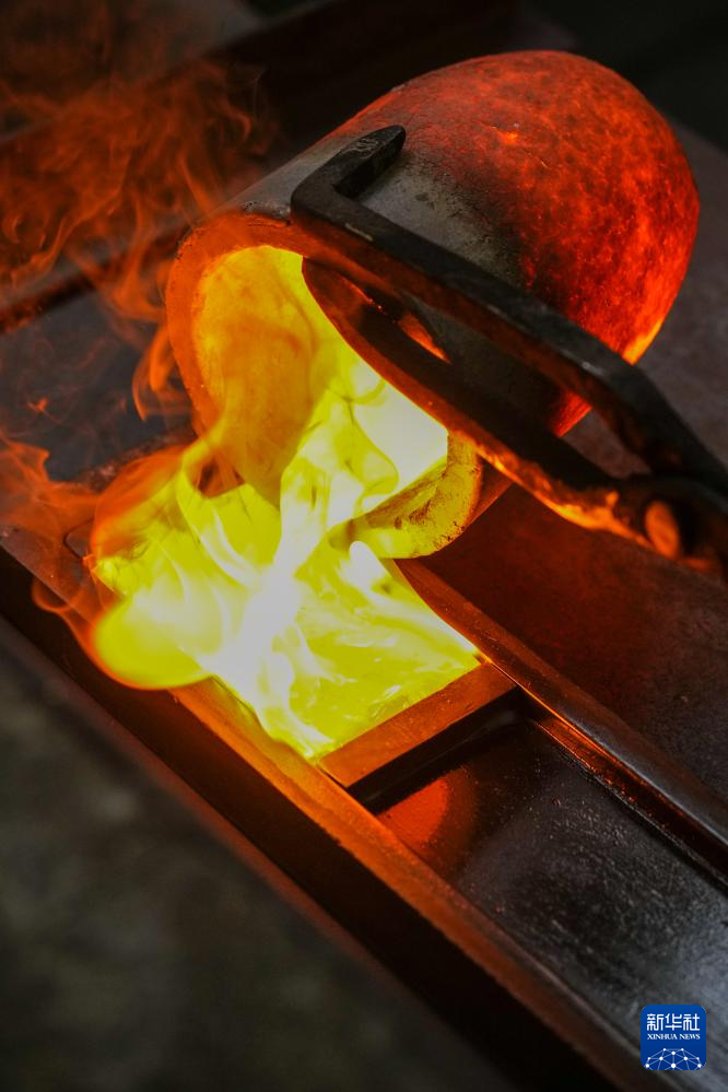 在南京金陵金箔集团股份有限公司,工人将熔化的金水倒入容器(2月10日摄)。
