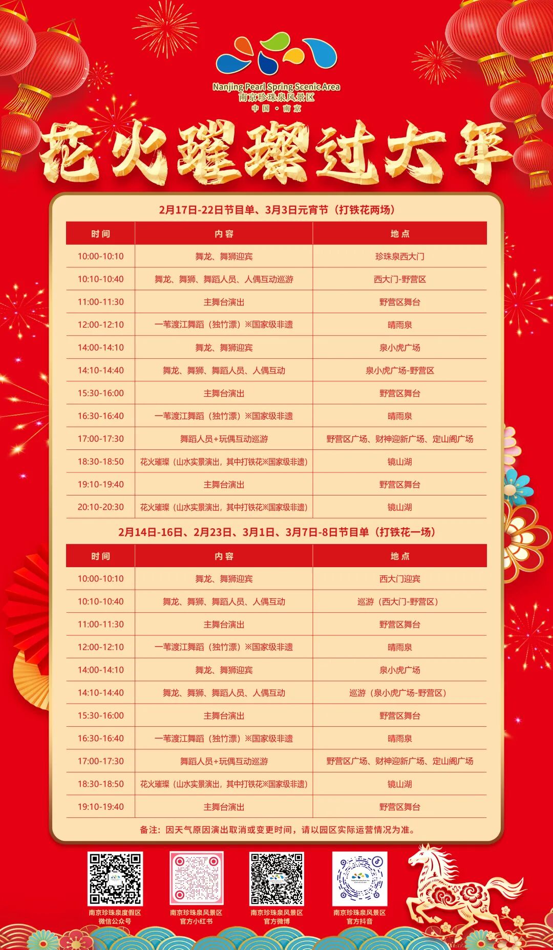非遗打铁花表演时间:即日起至3月8日,每晚夜幕降临时分上演。更多节目详情请关注景区官方发布。