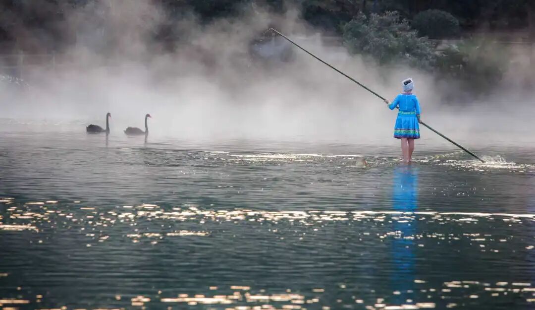 珍珠泉的“水”不仅是打铁花的舞台,更串联起整个新春叙事。白天,晴雨泉水域上演贵州千年绝技“独竹漂”,表演者仅凭一根青竹漂于水面,重现达摩“一苇渡江”的传说意境。夜晚,竹排灯组点缀湖面,光影与水波交相辉映,营造出独特的节日氛围。