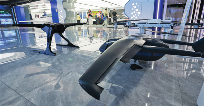 在位于无锡的长三角空间信息数字产业特色示范园,观众在观摩企业设计生产的无人机模型 (2024年9月9日摄)杨磊摄 / 本刊