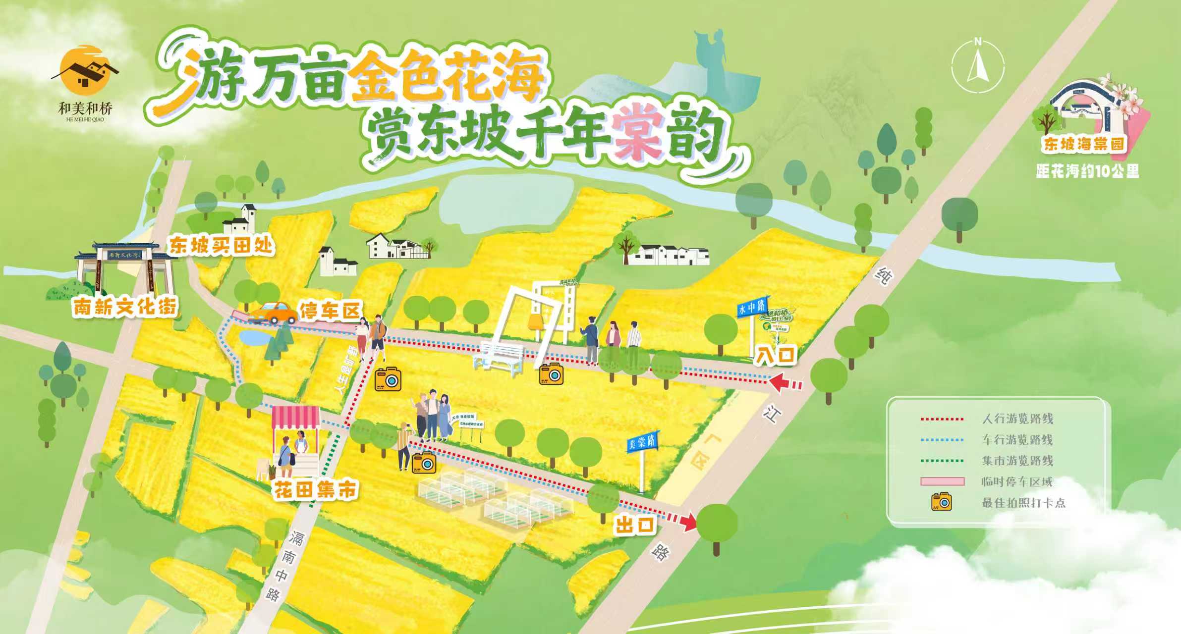农业产业的提质增效,为农文旅融合发展筑牢了底气、拓宽了路径。为激活乡村文旅流量,打造独具特色的乡村文旅品牌,和桥镇深度挖掘桥、水、田、村等本土特色资源,以“游和桥万亩金花 赏东坡千年棠韵”为主题,将万亩油菜花田、东坡海棠、南新老街等特色点位串珠成链,精心打造春日特色赏花线路。万亩油菜花田中,多个极简风格的打卡点错落分布,既精准契合年轻群体拍照出片的需求,又巧妙植入和桥地域文化符号,让美景与文化相得益彰。田间市集更是烟火气十足,和桥豆腐干、和桥大米等地方特色产品亮相。