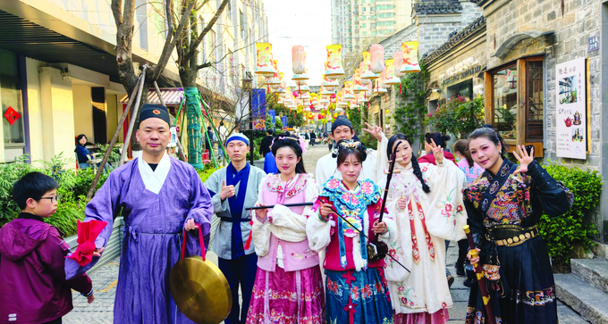 昨天,着传统服饰的人们走在南京熙南里街区,为春日南京营造浓烈文化氛围。吴俊 摄