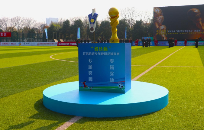 开幕式上,江苏省教育厅厅长、省委教育工委书记江涌,江苏省体育局局长陈少军共同为全新设计的联赛专属奖杯、奖牌揭幕。奖杯定名“共创”,以水韵为基、桃李为脉、新芽为势、足球为冠,通过参数化设计方法,融合江苏水韵文化与校园足球育人理念,生动诠释了立德树人、以体育人的教育初心,象征了团结拼搏、携手奋进、共创共赢的足球精神。