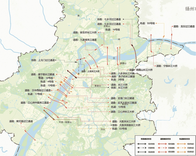南京市规划和自然资源局市政处相关负责人介绍,到2035年,南京规划24处共27条过江通道,涵盖铁路、轨道和道路等多种类型。其中,轨道规划建设17号线、13号线、18号线和14号线4条,在建4号线二期和S5号线2条,已建成S3号线、3号线和10号线3条;道路规划建设锦文路过江通道、汉中西路过江通道和七乡河过江通道3条,在建建宁路长江隧道1条,已建成新生圩长江大桥、宁扬长江大桥、栖霞山长江大桥、八卦洲长江大桥、燕子矶长江隧道、长江大桥、定淮门长江隧道、应天大街长江隧道、江心洲长江大桥和大胜关长江大桥10条;铁路线路规划建设七乡河过江通道1条,在建上元门过江通道1条,已建成长江大桥和大胜关铁路长江大桥2座。南京还规划建设有夹江交通线路3条——江心洲中部夹江通道、九里埂夹江通道和上坝夹江大桥。远景至2050年,规划龙仪过江通道。
