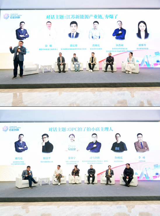 沙龙活动现场,理想汽车制造工程负责人徐勉、通用决策智能研究所执行所长郭宏博、智谷趋势总编辑黄狮虎、张雪机车供应链企业常州容天乐东方轴承有限公司董事长杨燕敏、远川研究所总监廖雅琴等来自整车制造、科研机构、产业研究及核心零部件企业的嘉宾,围绕“江苏新能源产业链,夯爆了”主题展开深度对话。璞跃中国首席执行官、璞跃常州OPC国际社区创始人徐洁平;“苏超”小微赞助商代表、东哈烧烤店主理人张敬宇;南京硅基智能创始人、董事长、常州硅基智能OPC社区创始人司马华鹏;财经无忌创始人陶魏斌;正解局主编李峰等嘉宾,聚焦“OPC拍了拍小店主理人”主题展开讨论。